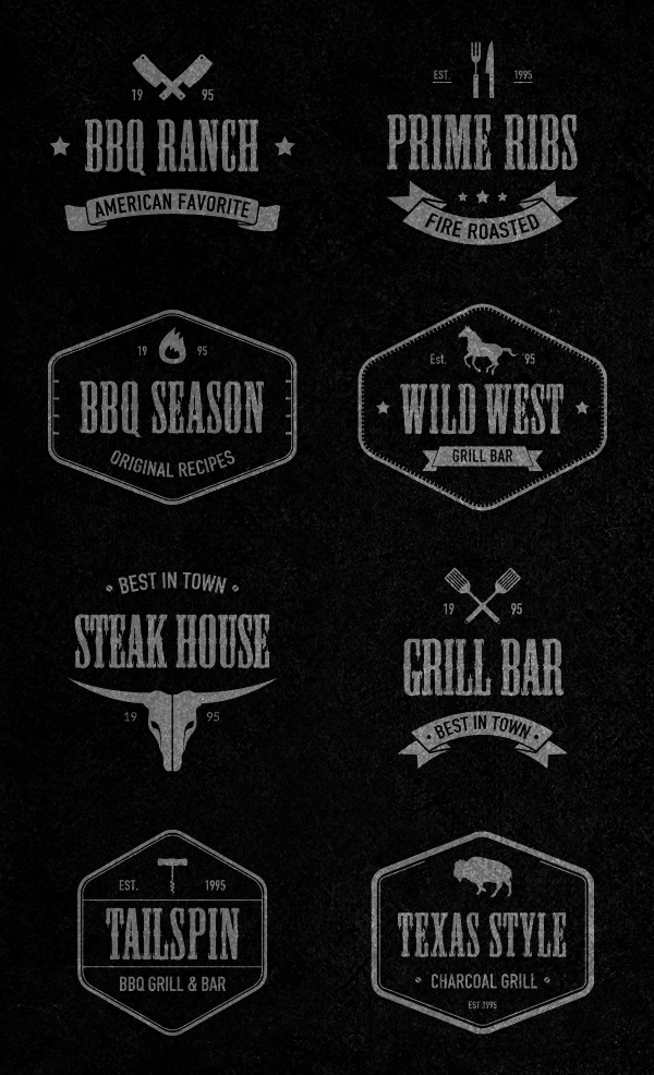 8 BBQ & GRILL BADGES. Create your own badge or logo with a vintage touch. Badges are ready to print, go on web, t-shirt, you name it! Scalable vector file; Fully editable. Help file with font details provided.